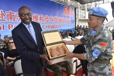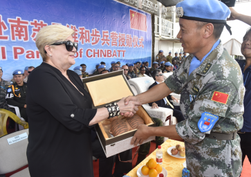 聯(lián)南蘇團(tuán)維和部隊(duì)向國(guó)際友人贈(zèng)彩陶助和諧